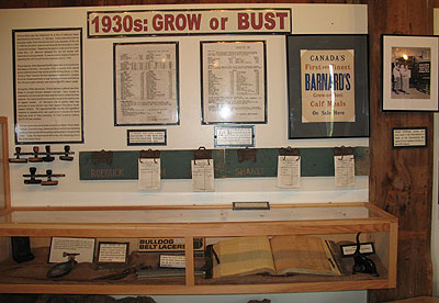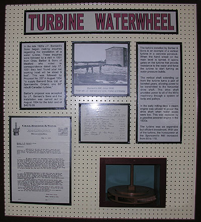 Visitors to the main level will see a single roller mill, double roller mill and plate grinder that have been part of the mill’s machinery for more than 100 years. By the early 1900s the single roller mill was being used to crush oats for poultry and livestock feed. When the turbine is running this roller mill operates for display purposes. The milling artifacts displayed are all original to the Spencerville Mill. In the 1930s Spencerville, with a population of approximately 250, was a thriving community. Among its businesses were a railway depot, bus stop, a doctor, dentist, bank, post office, barber, blacksmith, tinsmith, two garages, and five general stores to serve the surrounding agricultural community.